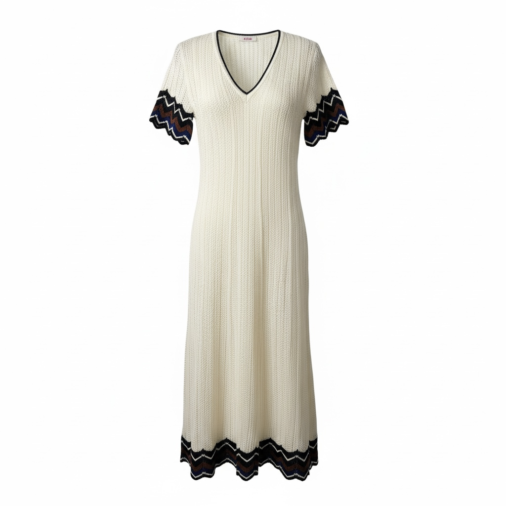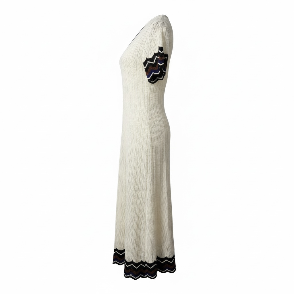 This long, knitted dress features a V-neckline and short sleeves with zigzag patterns in black, blue, and brown.