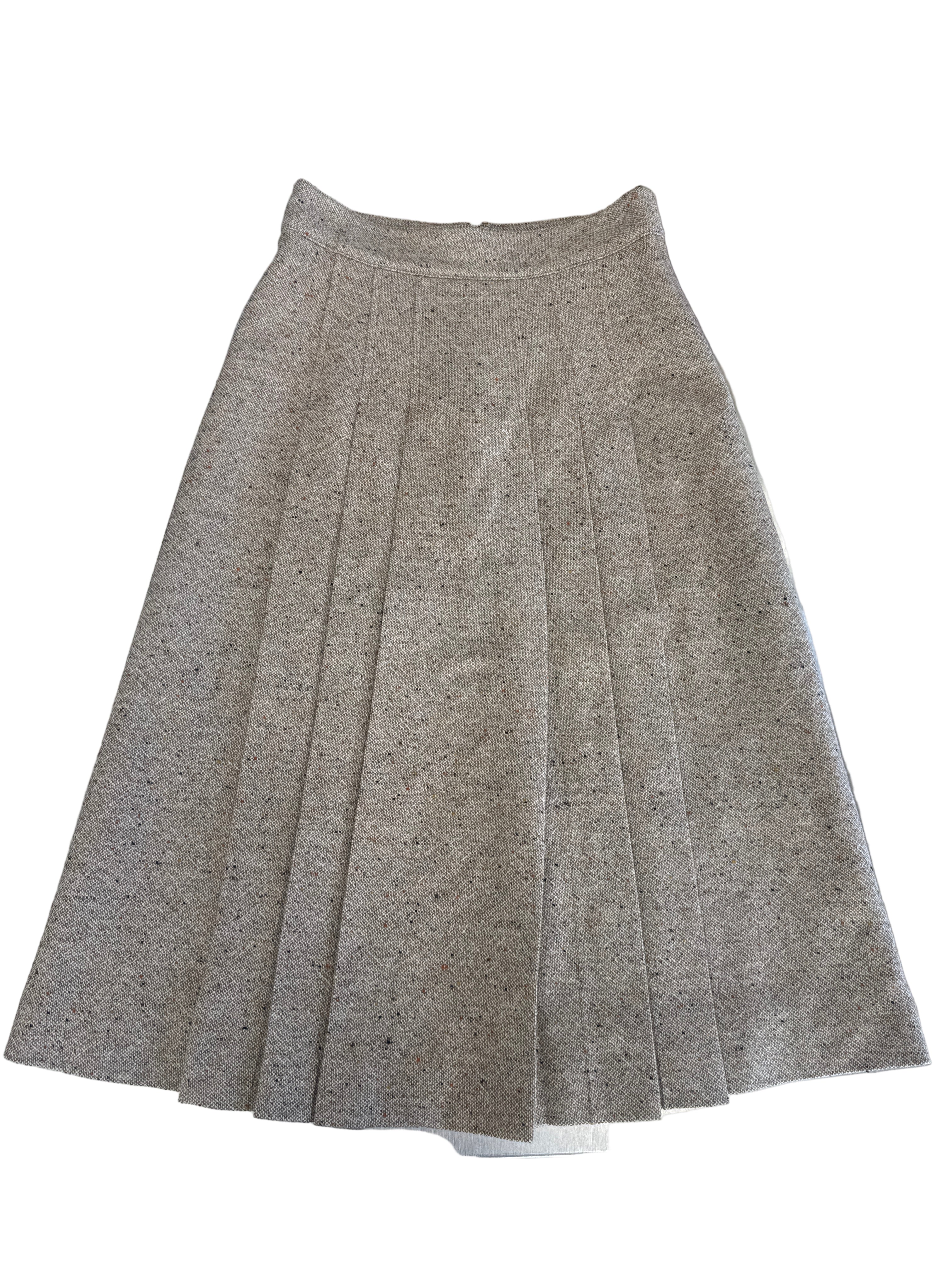 A masterclass in autumnal elegance. This beautifully crafted midi skirt channels a timeless, academic charm with its rich, flecked tweed fabric. The silhouette is designed to be incredibly flattering, featuring a smooth, fitted yoke that releases into a cascade of sharp knife pleats, creating beautiful movement with every step. It's the perfect piece for a polished, sophisticated look this season.