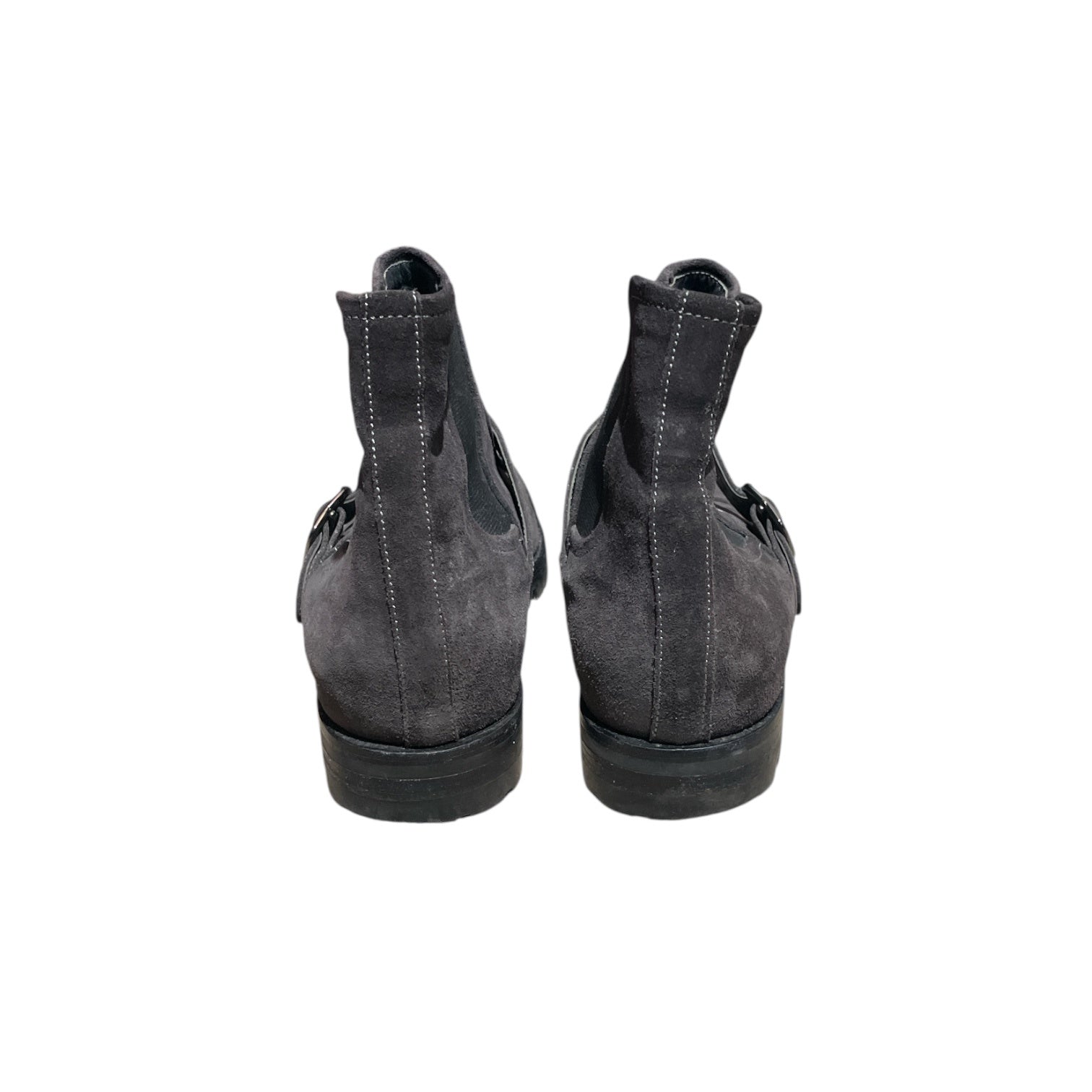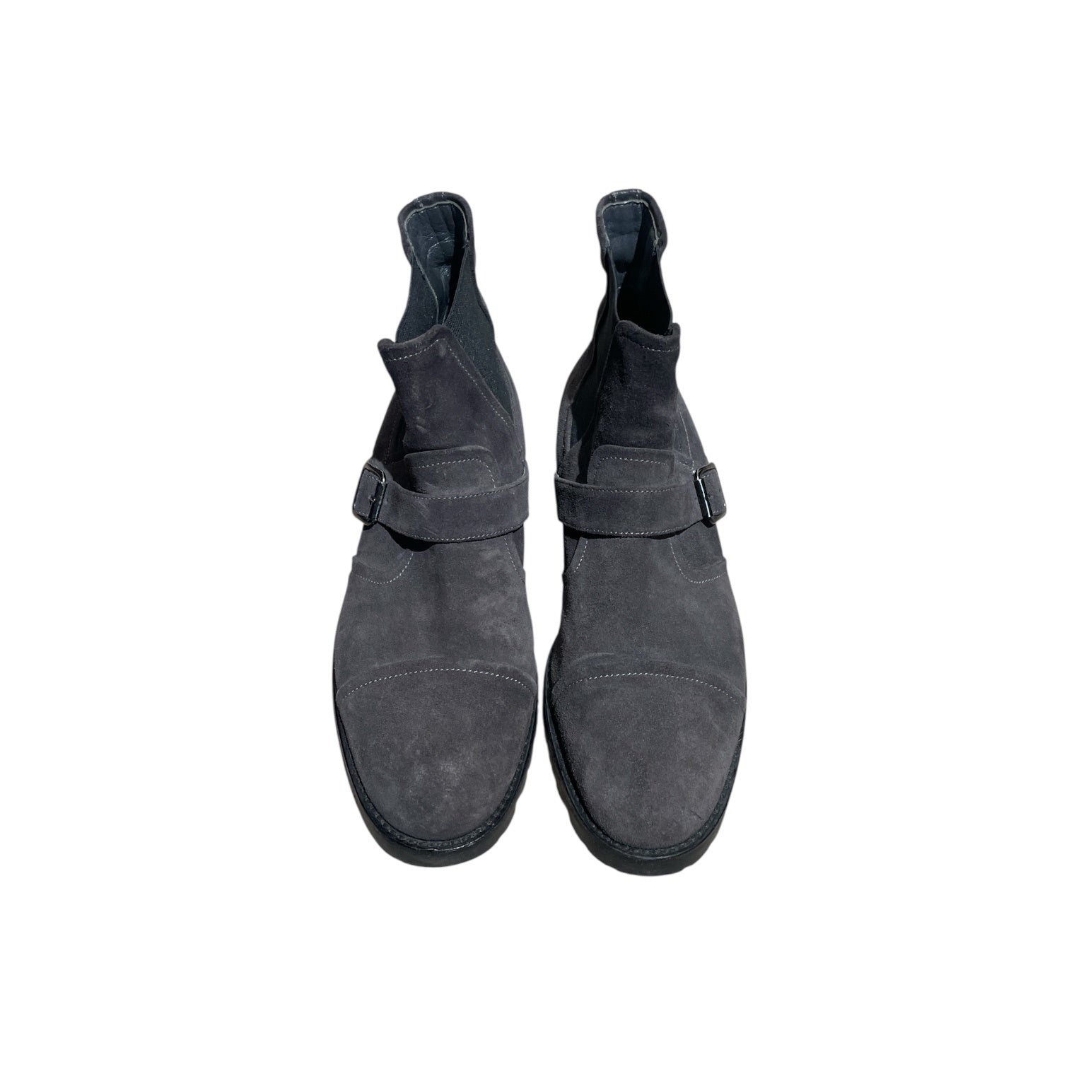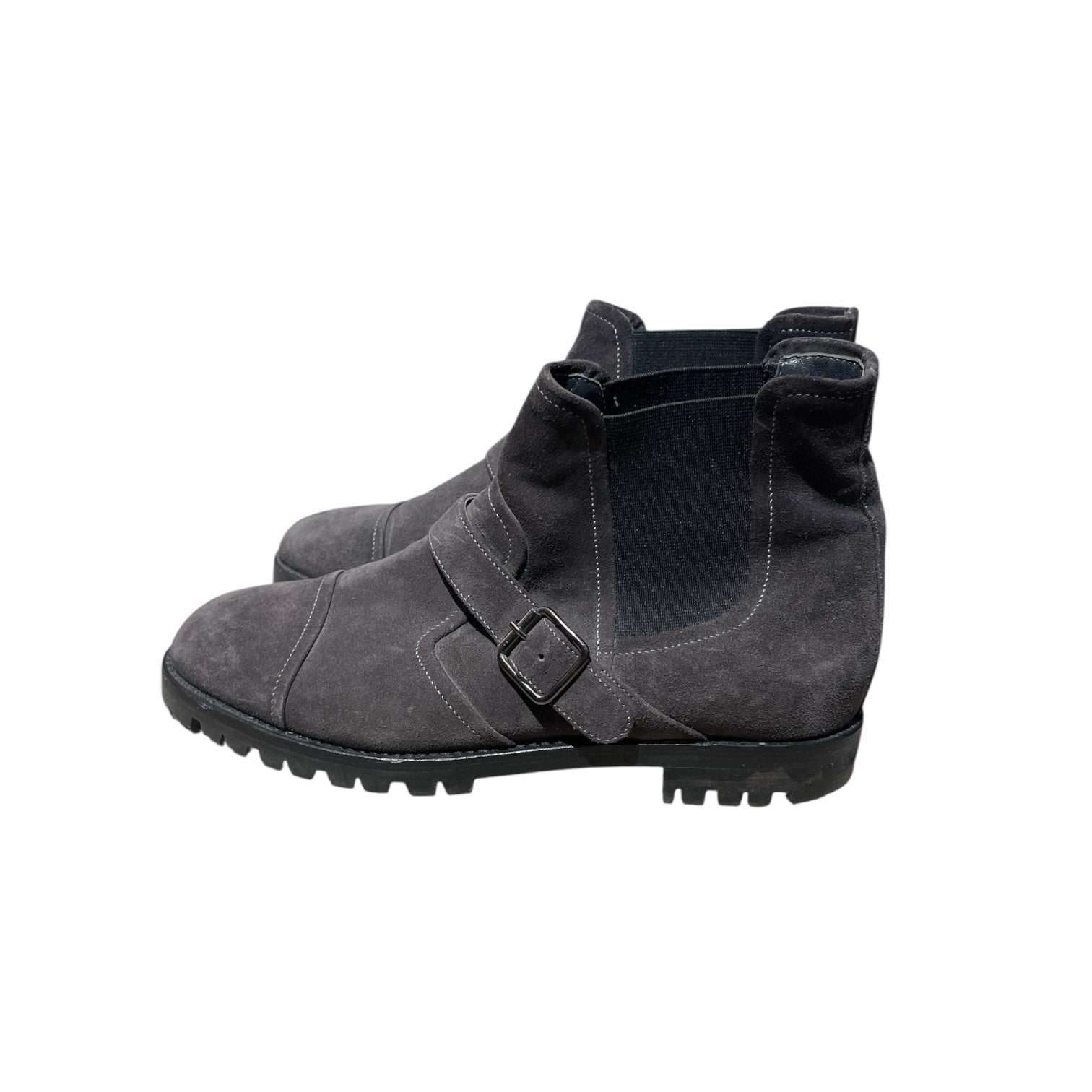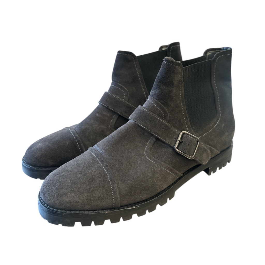 These stylish ankle boots feature a rugged design with a buckle strap for added edge. Crafted from soft suede leather, they combine durability with comfort. The elastic side panels make for an easy slip-on fit. Perfect for making a fashion statement during the colder months.