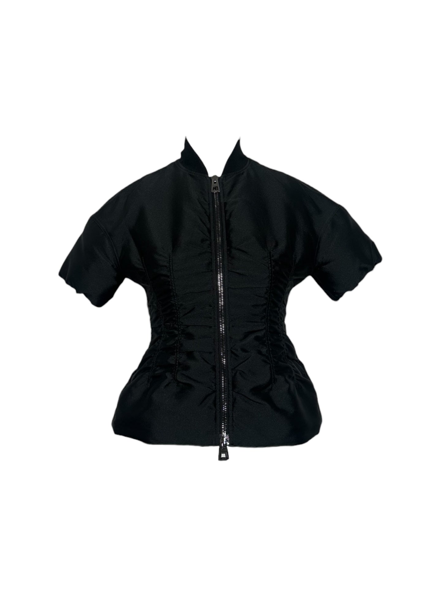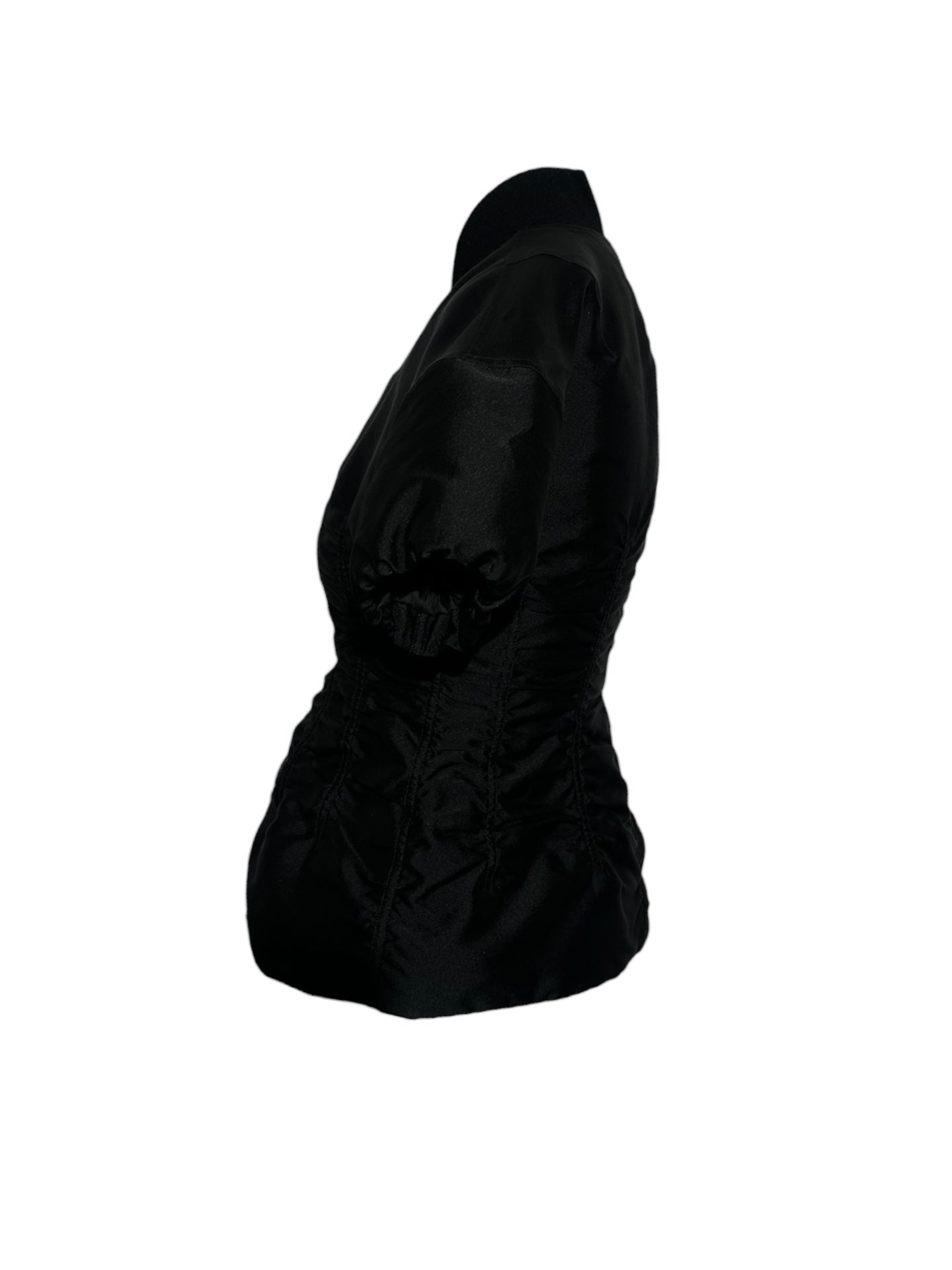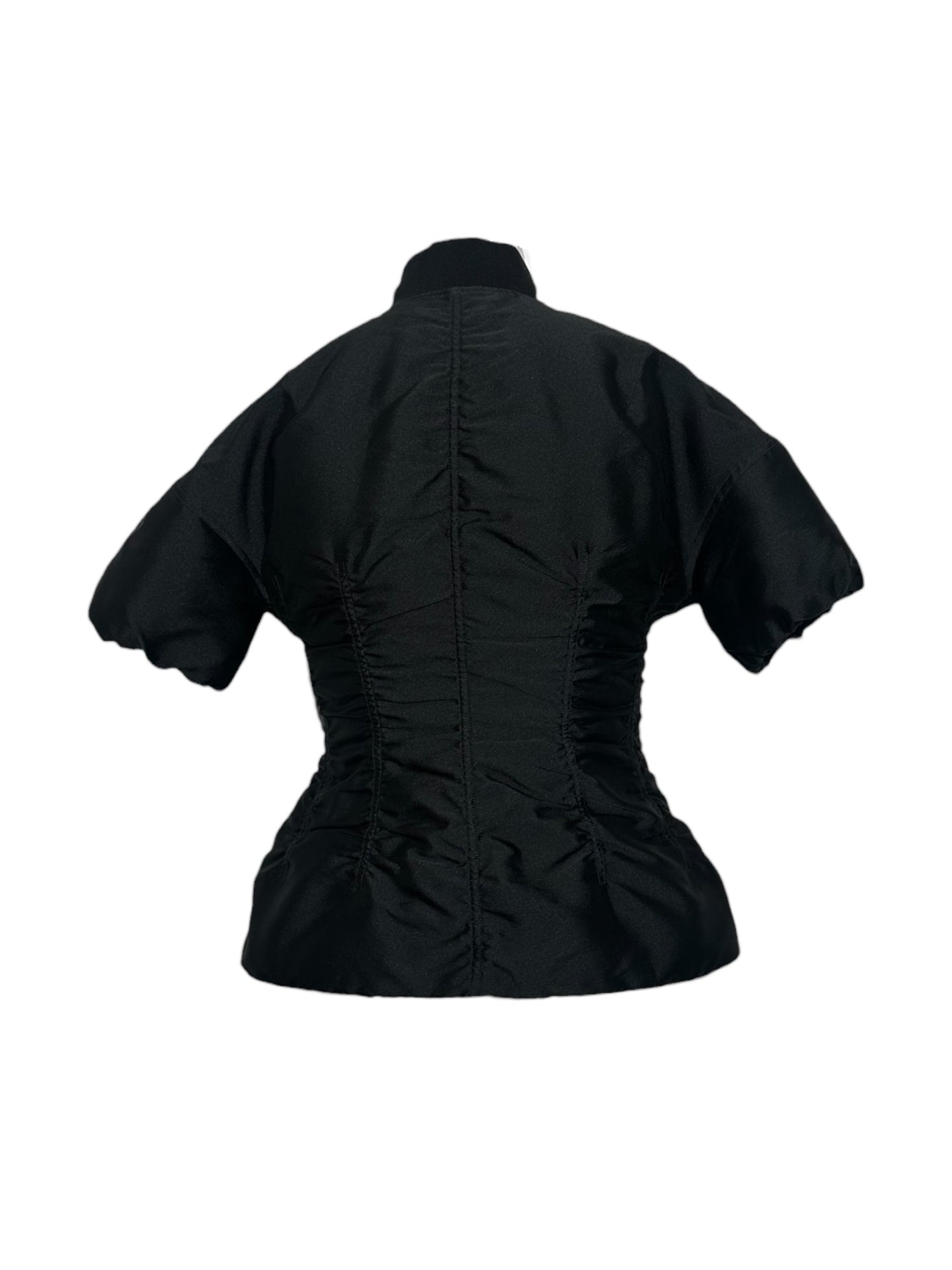 This Christian Dior black puffer jacket features a sleek, fitted silhouette with a front zipper closure. Its high collar adds a modern touch, making it perfect for staying warm in style. The shiny finish and subtle stitching details elevate its contemporary appeal.