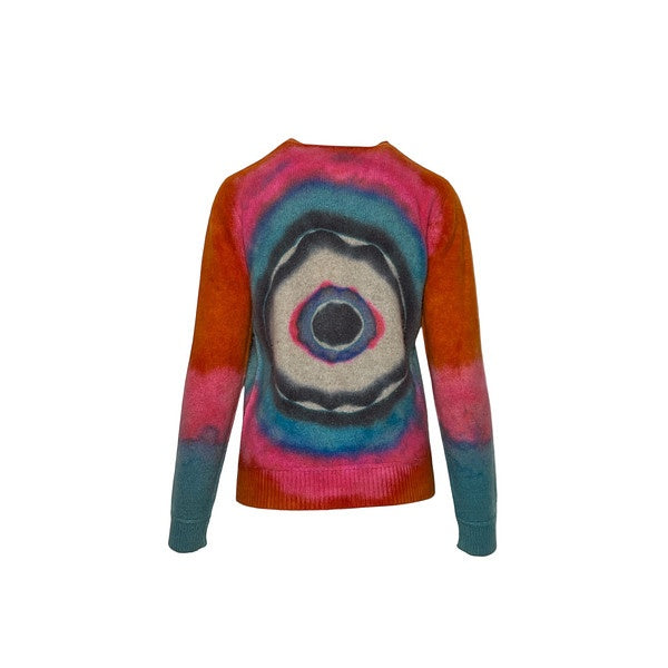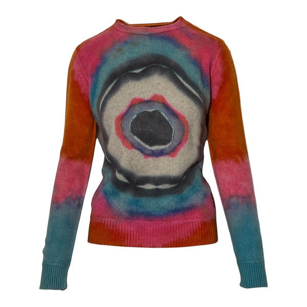 This vibrant knit sweater features an abstract, concentric circle pattern with bold, eye-catching colors. Crafted from wool or a wool blend, it offers both warmth and artistic style. The design combines a mix of orange, pink, blue, black, and beige, creating a striking visual effect.