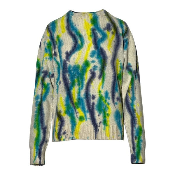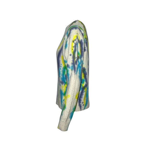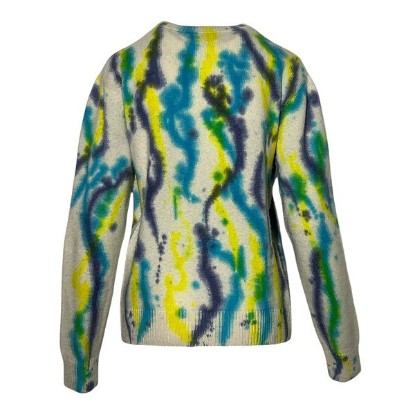 This vibrant knit sweater features an abstract, watercolor-inspired pattern with swirling lines in multiple colors. Made from a soft knitted material, it offers a comfortable fit with a casual yet artistic style. Perfect for adding a splash of color to your wardrobe.